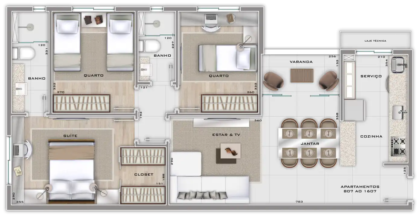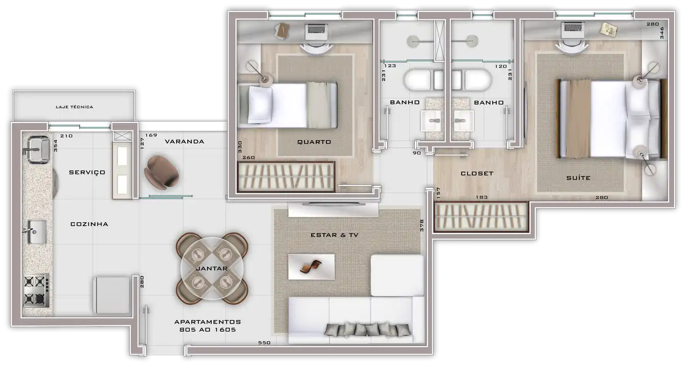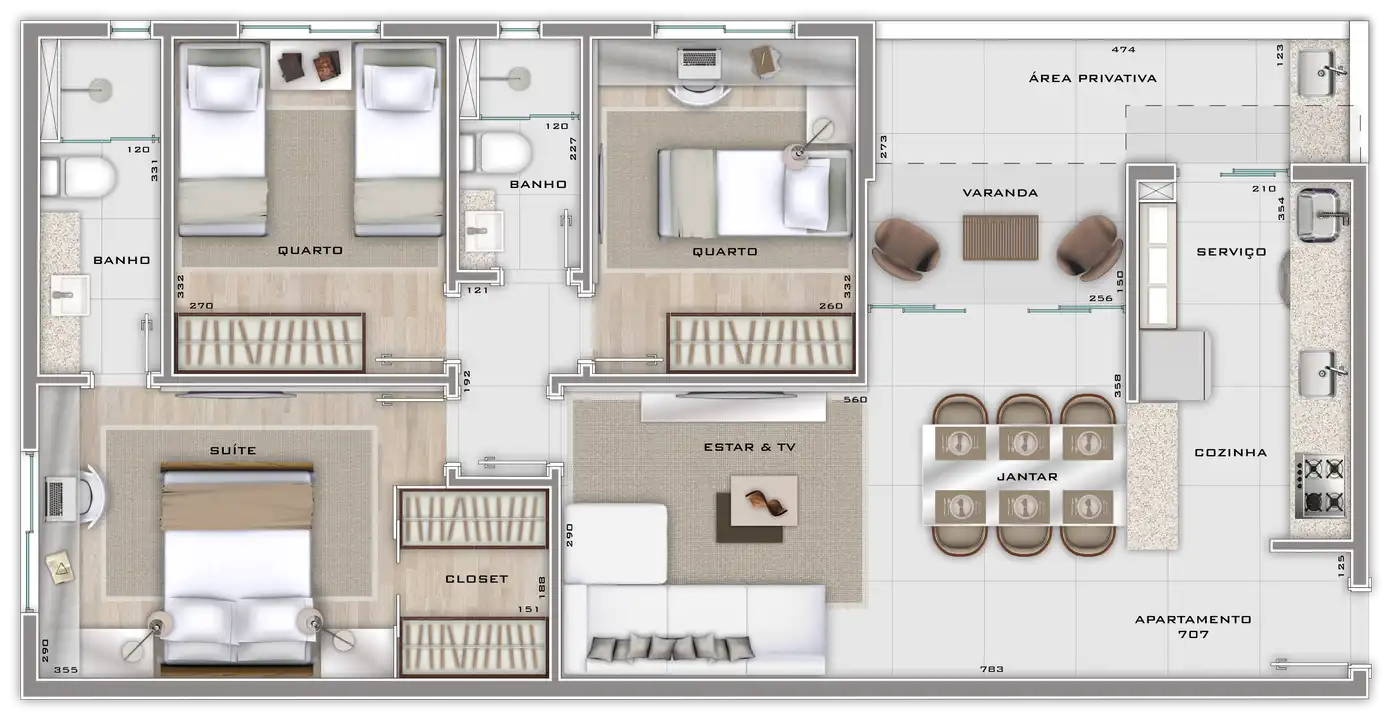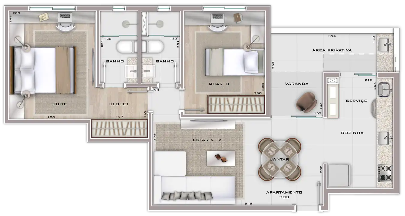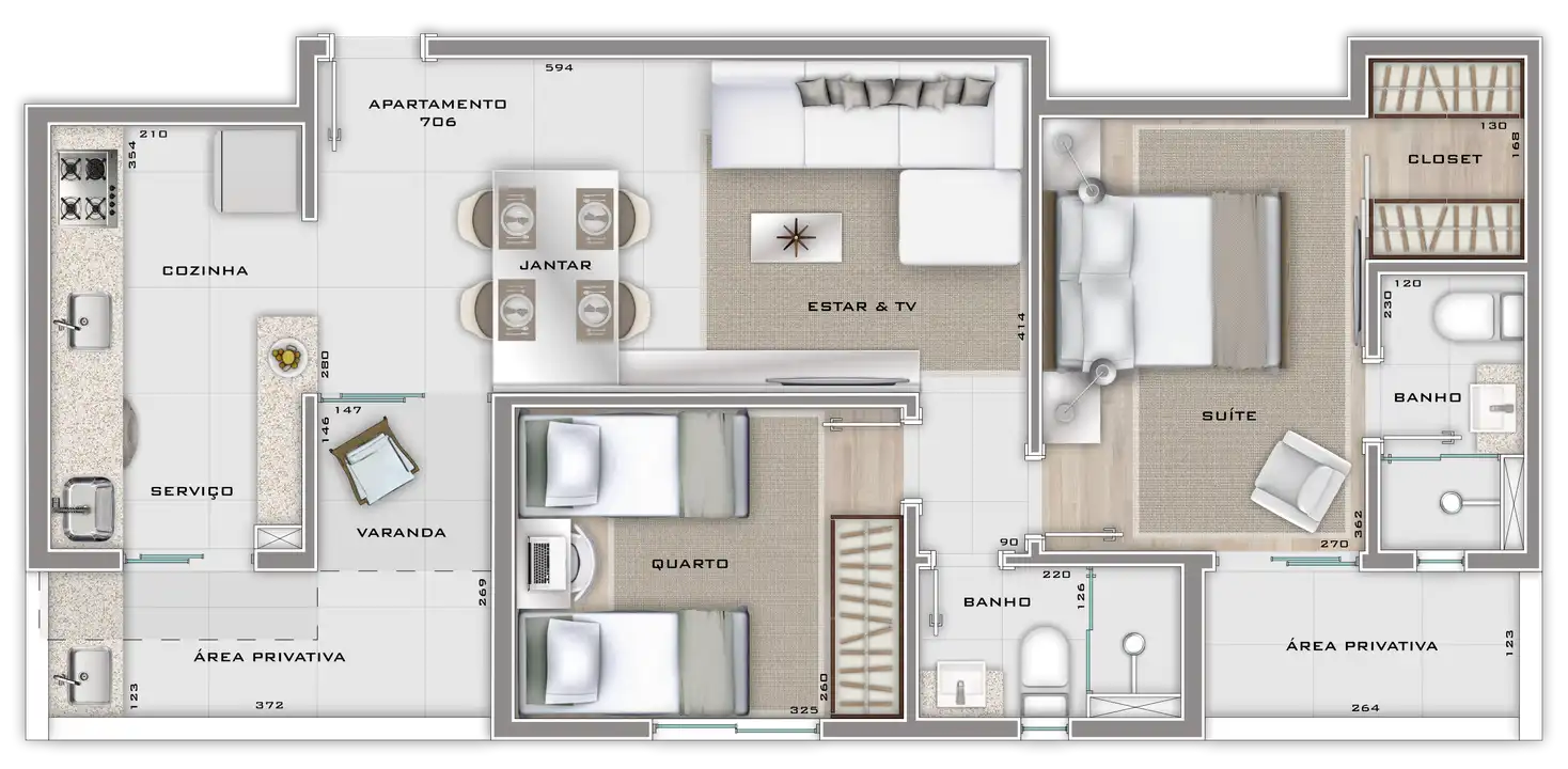 Área total de 67,23m² e 61,55m² de área útil.