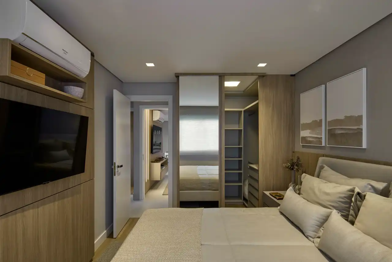 O imóvel tem 2 quartos, sendo 1 suíte, e 2 vagas de garagem.