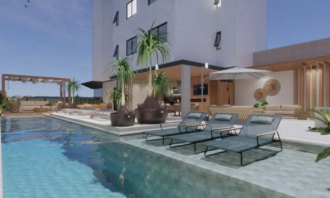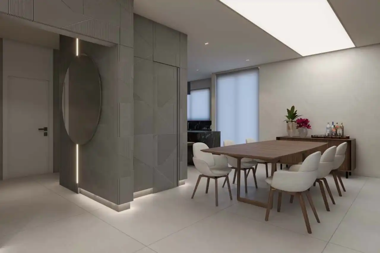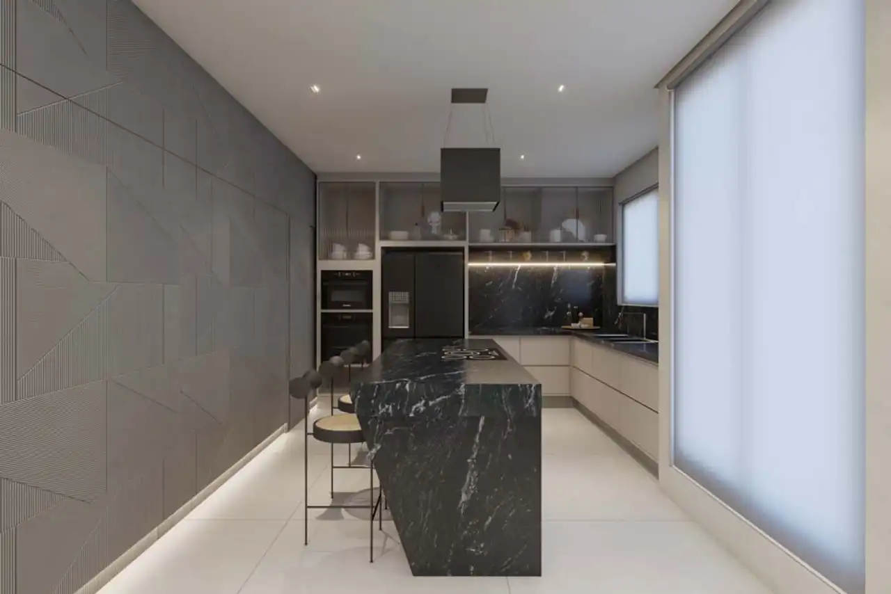 O imóvel tem 5 quartos, sendo 4 suítes, e 4 vagas de garagem.