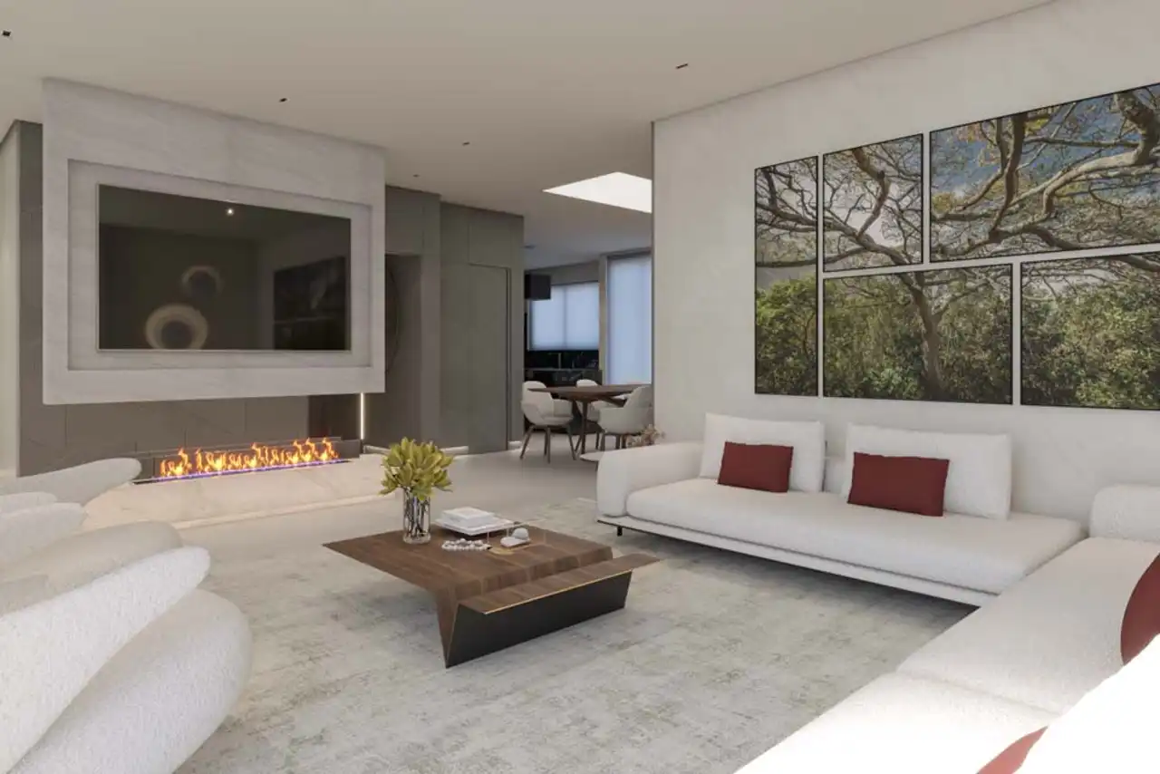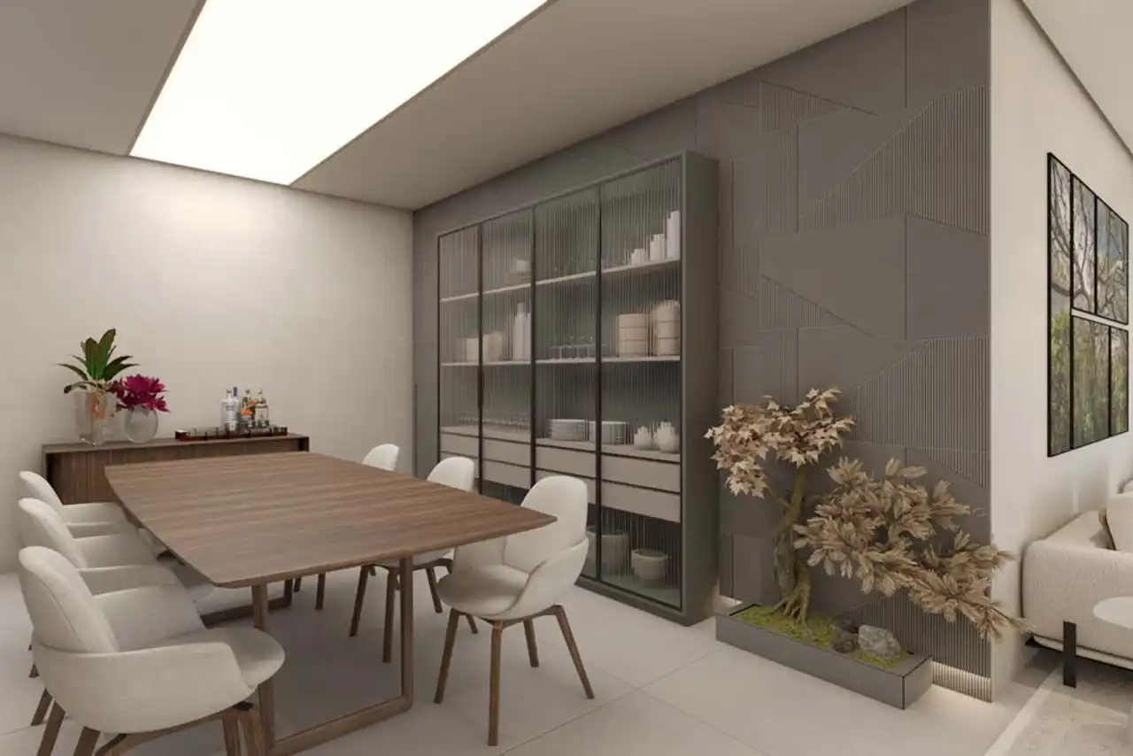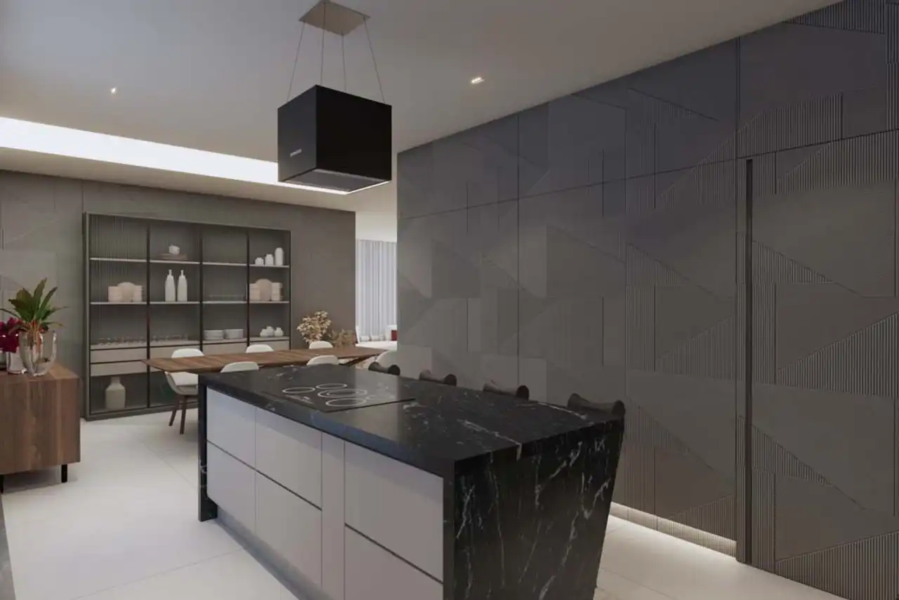 O imóvel tem 5 quartos, sendo 4 suítes, e 4 vagas de garagem.